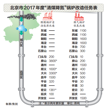 据悉,“清煤降氮”工程是完成2017年PM2.5年均浓度达到60微克/立方米目标的重要保障措施。根据2017年清洁空气行动计划的任务分解要求,2017年10月底前,全市要基本淘汰远郊区平原地区10蒸吨及以下和建成区35蒸吨及以下燃煤华体会世界杯(中国)科技有限公司,完成4000蒸吨左右燃煤华体会世界杯(中国)科技有限公司清洁能源改造任务,新建的燃气华体会世界杯(中国)科技有限公司都必须达到氮氧化物30毫克/立方米的排放限值。其中,房山区、大兴区要淘汰包括燃煤集中供热中心在内的燃煤华体会世界杯(中国)科技有限公司,实现辖区平原地区基本无燃煤华体会世界杯(中国)科技有限公司。到2017年年底,各区要在政府网站上向社会公开辖区剩余未改造的在用燃煤华体会世界杯(中国)科技有限公司清单,接受公众监督。