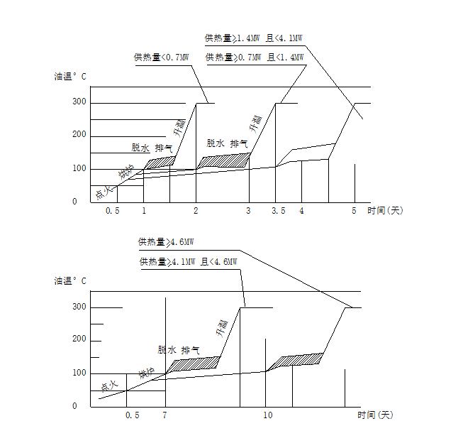 煮油过程主要是排除系统中的水份,水份必须在图示温度范围及时间内汽化。以确保导热油中产生的水蒸汽不重新凝结成水。系统中水份积存越多煮油时间越长。煮油又能排除油中低挥发成份。当用热系统较大时,应根据实际情况,适当增加脱水排汽时间。